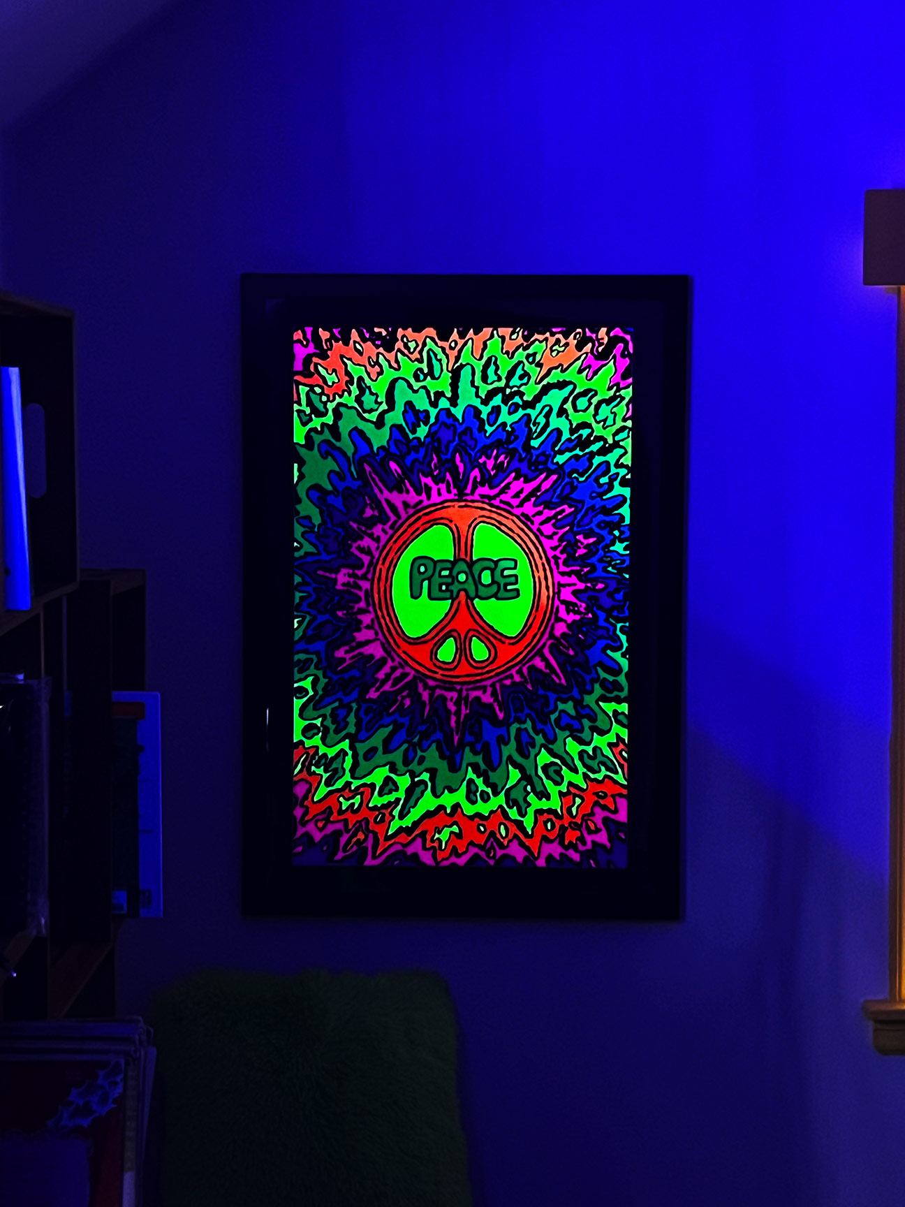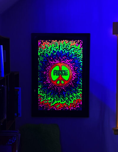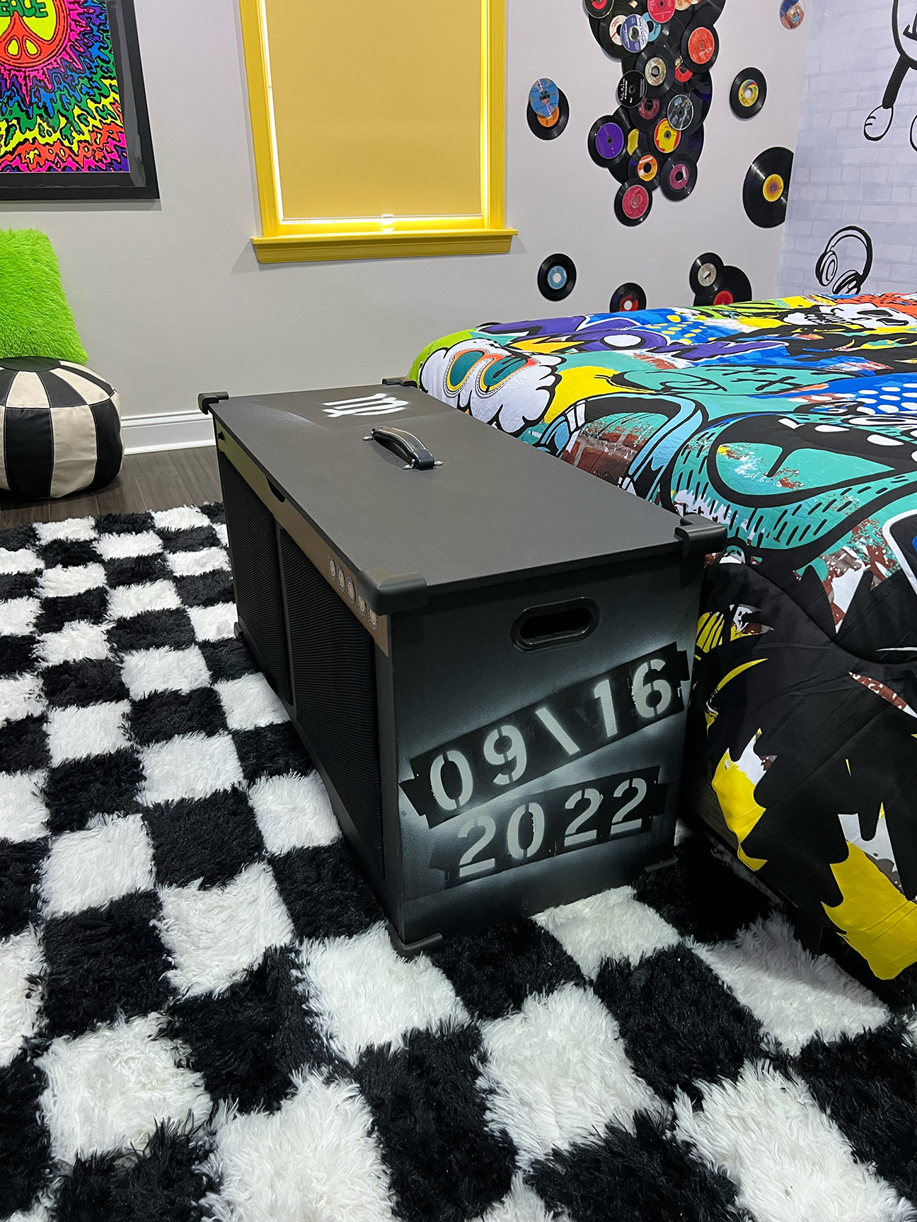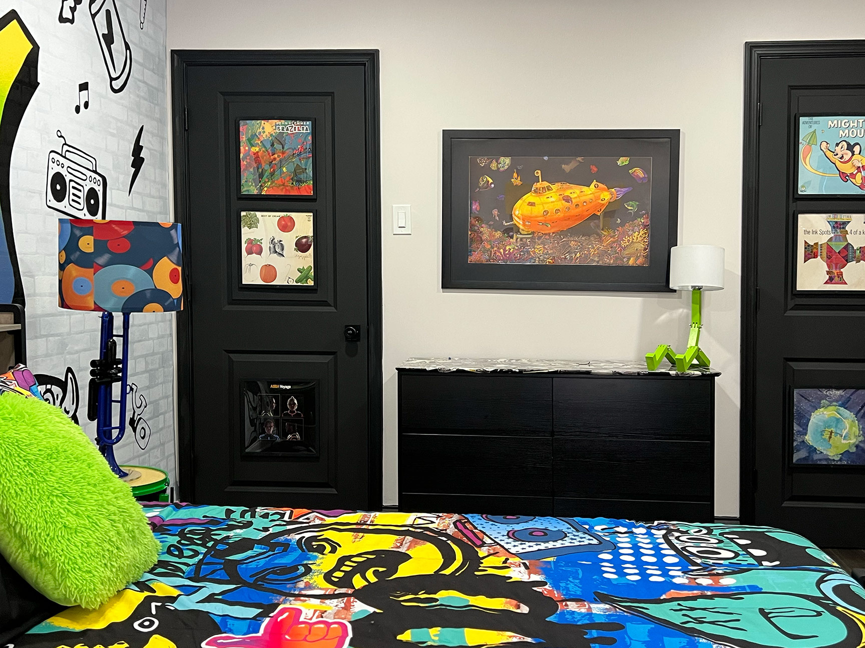 Material and surface treatments throughout the room were carefully considered to balance visual intensity. The dresser top, for example, was reworked using predominantly black-and-white imagery with restrained use of color, intentionally minimizing competition with the blacklight poster above. It was then sealed with an epoxy pour, providing a durable, high-gloss finish. This approach was echoed in other elements throughout the room, helping to establish a clear visual hierarchy while maintaining cohesion.