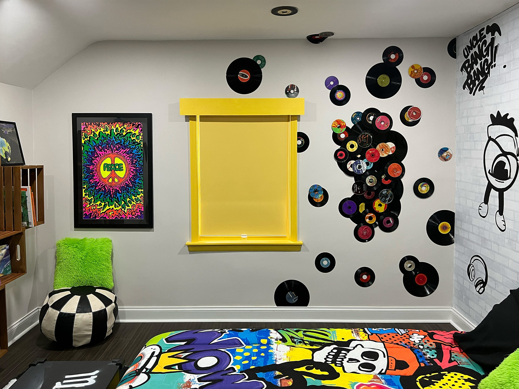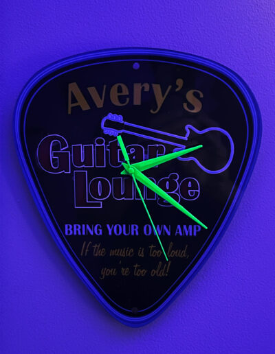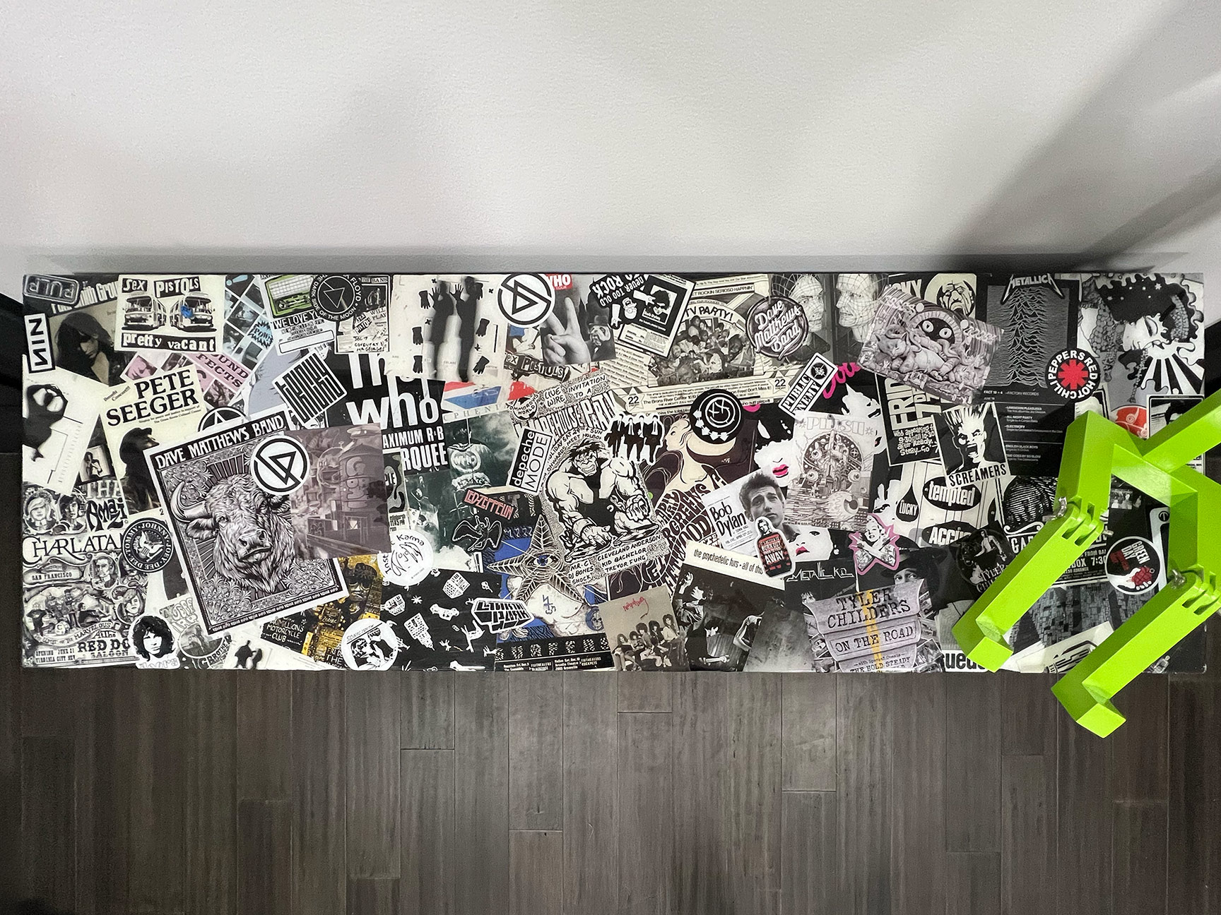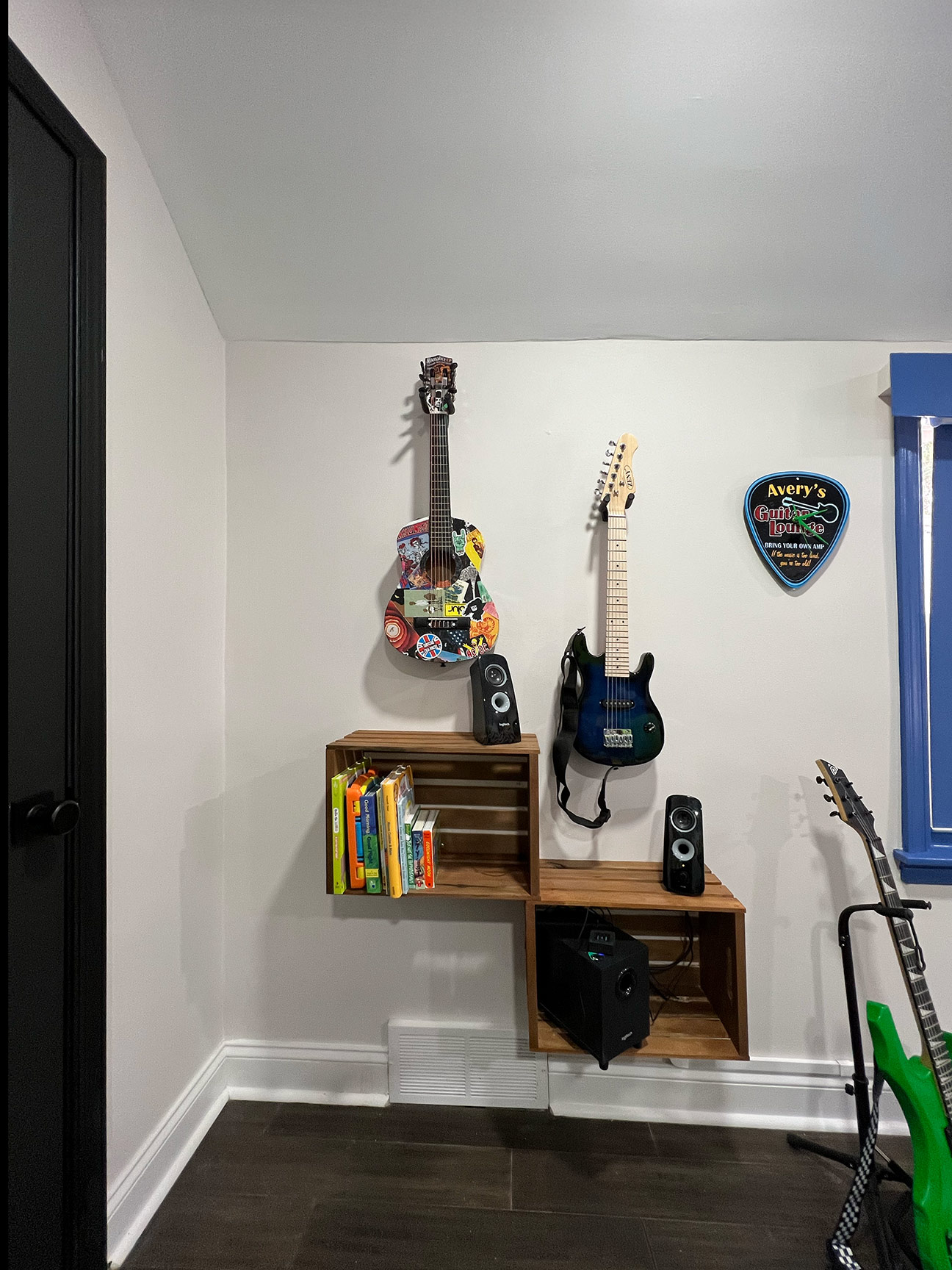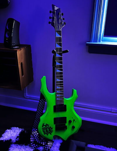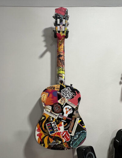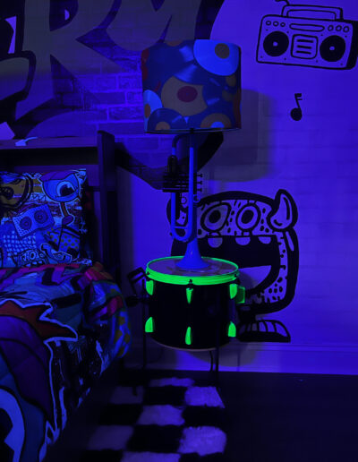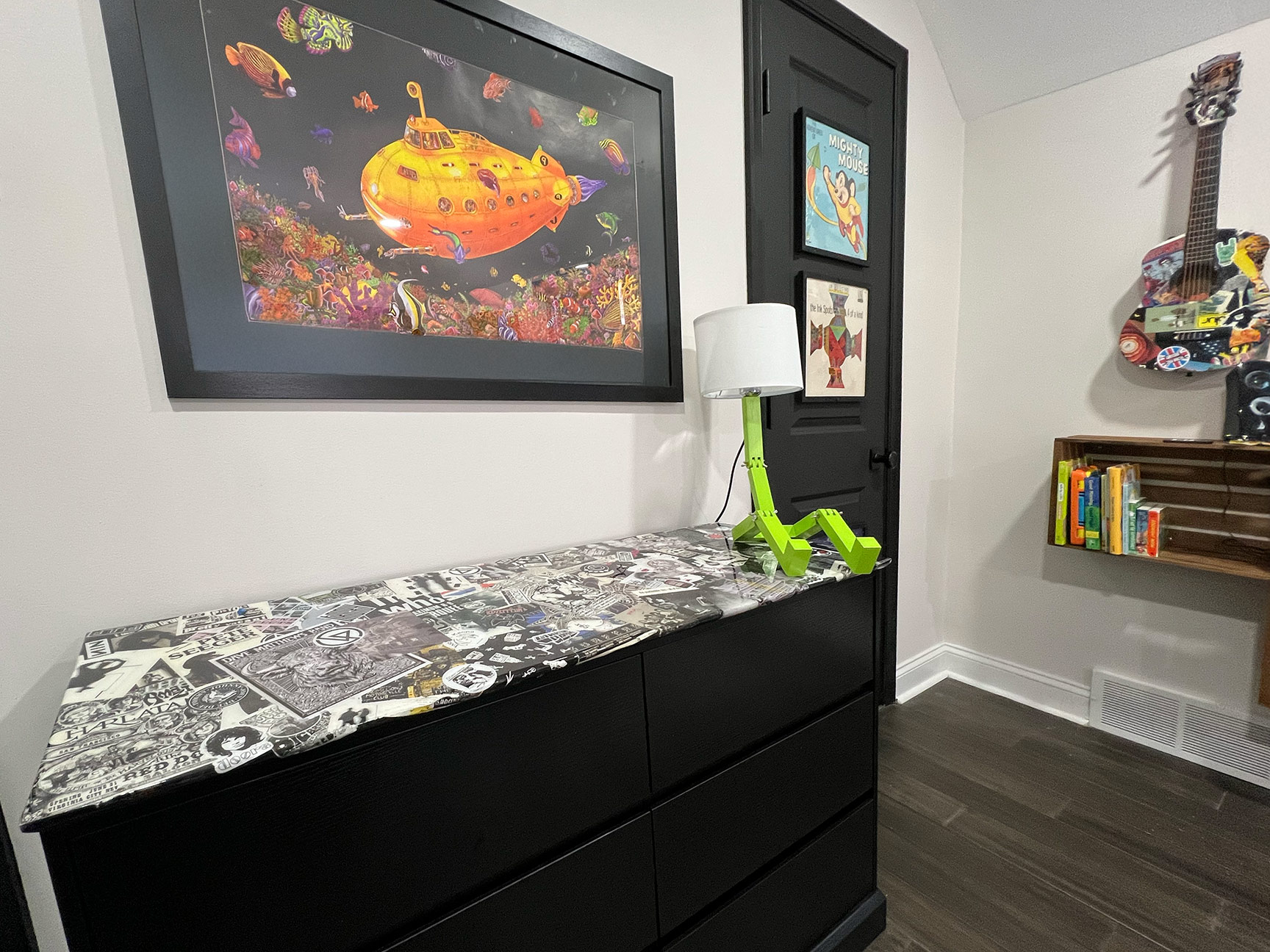 Two wall-mounted guitars further reinforce the musical theme. Both are fully playable children’s instruments. The acoustic guitar was decoupaged with music posters, stickers, and CD artwork, then sealed with multiple layers of polyurethane and finished with an epoxy pour, creating a durable, high-gloss surface. The full-size electric guitar was stripped and refinished in an eroded green paint that fluoresces under blacklight, enhancing the room’s transformation in different lighting conditions.