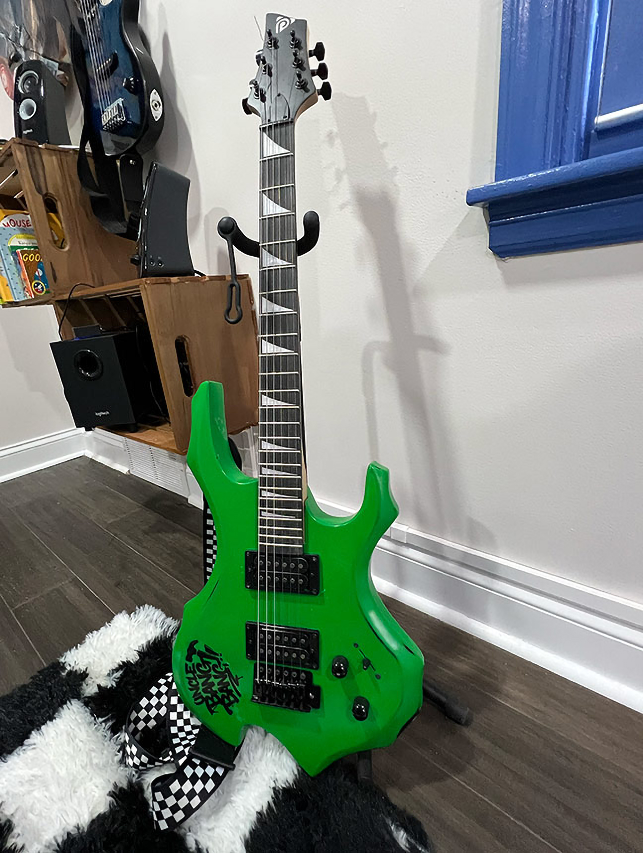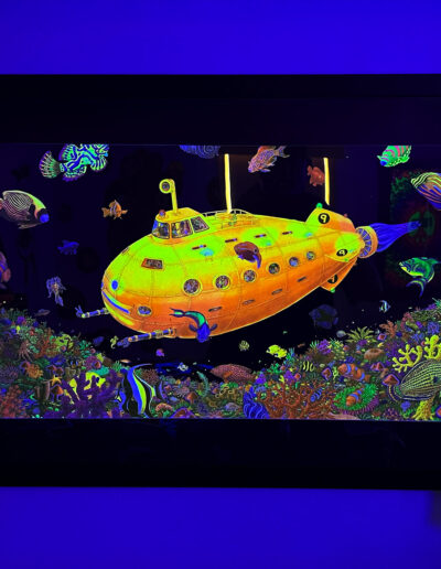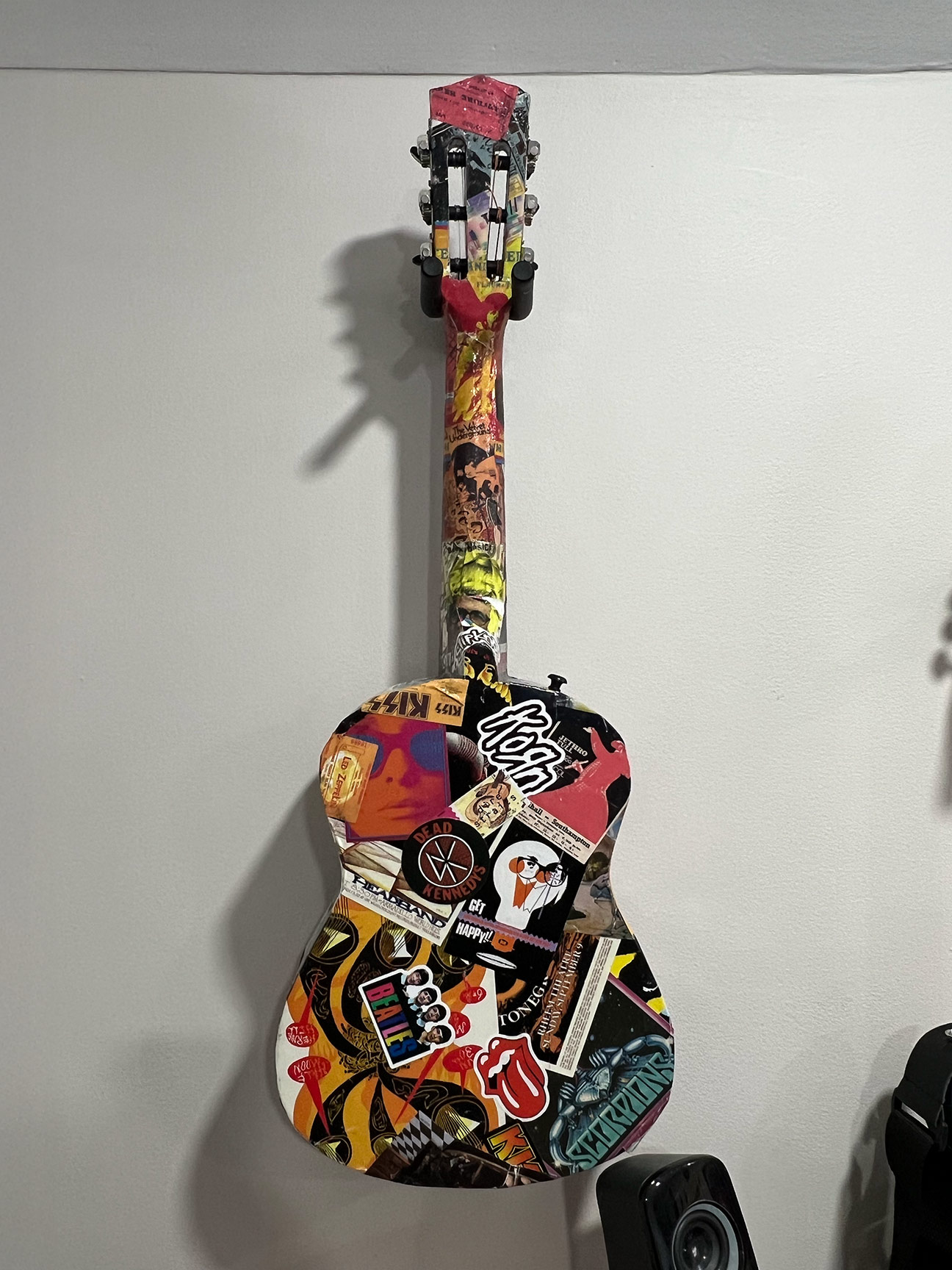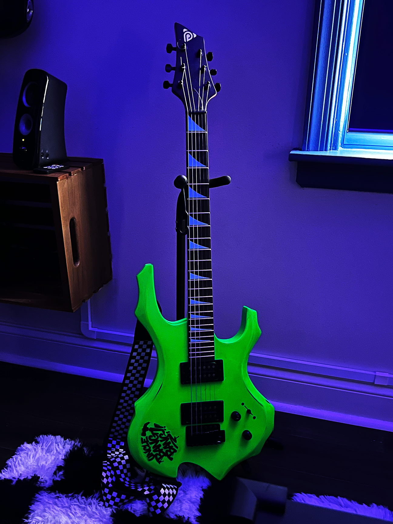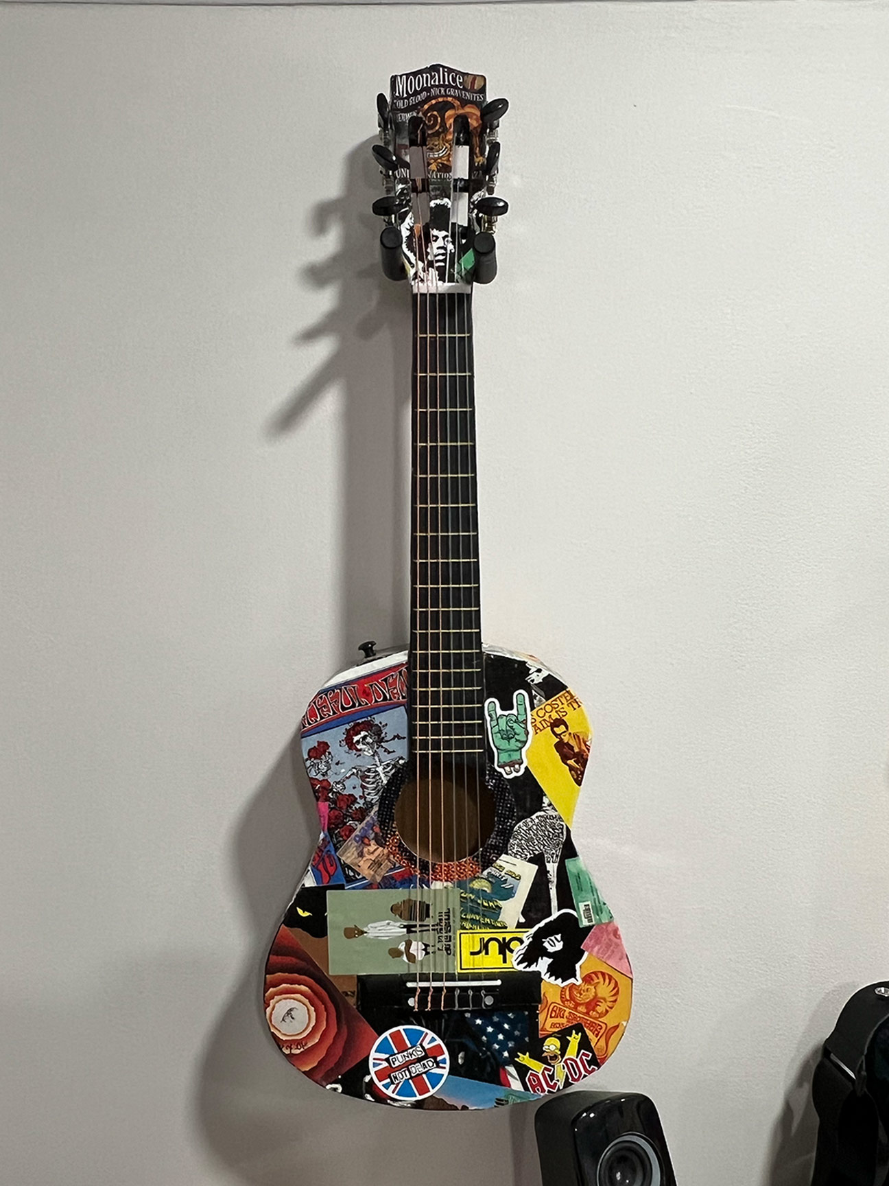 Two wall-mounted guitars further reinforce the musical theme. Both are fully playable children’s instruments. The acoustic guitar was decoupaged with music posters, stickers, and CD artwork, then sealed with multiple layers of polyurethane and finished with an epoxy pour, creating a durable, high-gloss surface. The full-size electric guitar was stripped and refinished in an eroded green paint that fluoresces under blacklight, enhancing the room’s transformation in different lighting conditions.