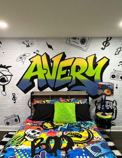 The back wall serves as a dynamic focal point. Constructed as a removable panel, it features embossed wallpaper that was whitewashed to soften the texture while maintaining depth. Behind the bed, a custom graffiti mural—painted by hand—draws directly from the room’s color palette and Avery’s bedspread, grounding the space in a cohesive visual language.