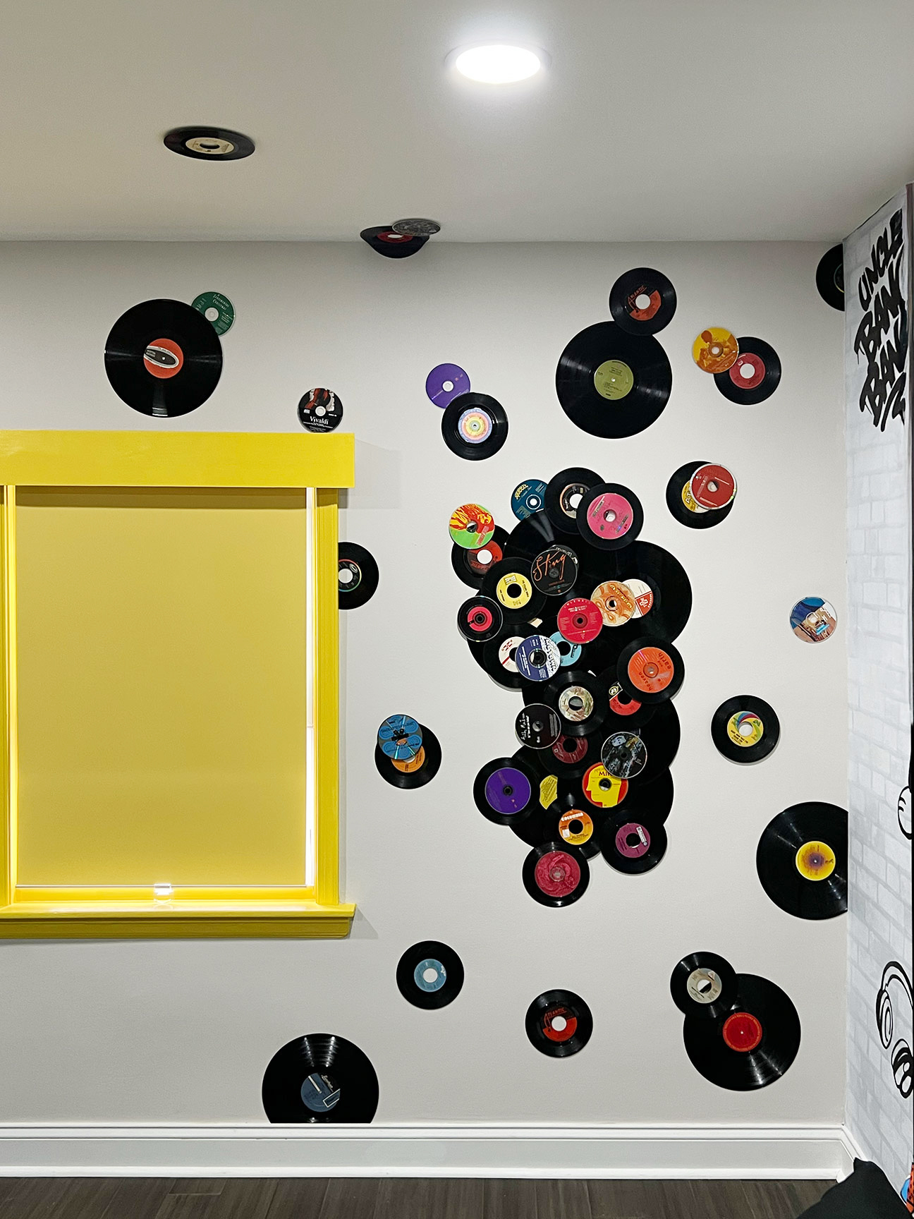 Upon entering the room, the viewer is immediately met with an album-inspired sculptural installation designed to create an explosion of energy. This element begins on the wall, extends into the window, and continues upward onto the ceiling, transforming the architecture into a continuous, immersive composition.
