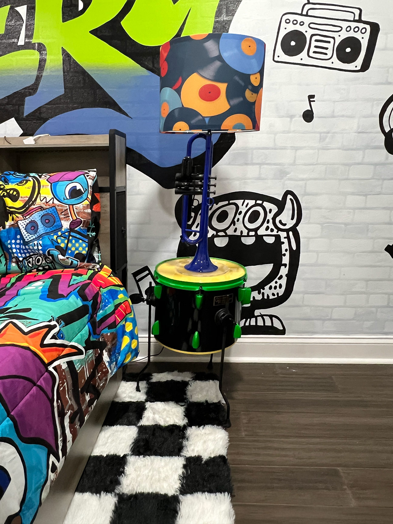 Additional custom pieces include a nightstand repurposed from a tom-tom drum, finished to match the guitar, and a playful lighting fixture constructed from a blue plastic trumpet mounted on a clear base for stability. A checkerboard rug unifies the room, reinforcing the rhythm and movement present throughout the design.