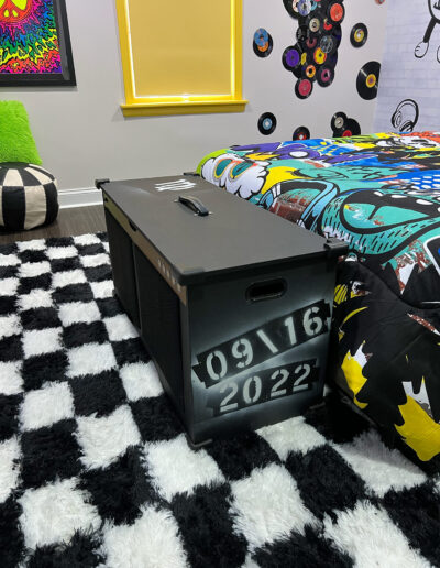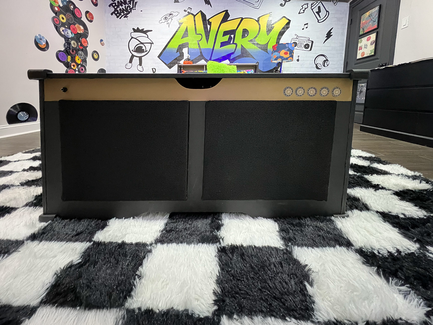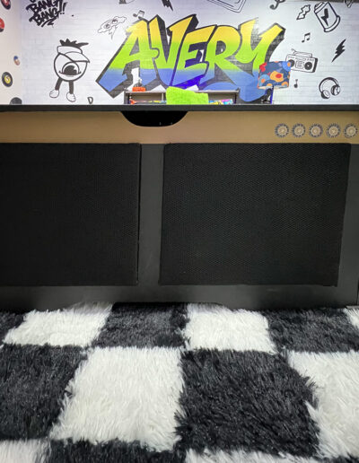 The toy chest was reupholstered in black embossed vinyl and customized with simulated speaker fronts. Knobs were rendered as stickers—an intentional decision based on Avery’s age—allowing for interaction without risk. Had the space been designed for an older child, functional hardware would have been incorporated.
